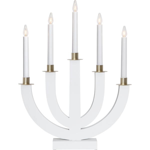 Vit träljusstake med 5 ljuskällor och guldmålad dekoration, lätt att placera och skapar en härlig julstämmning både i fönster och inne i rummet på tex en hylla eller skänk.